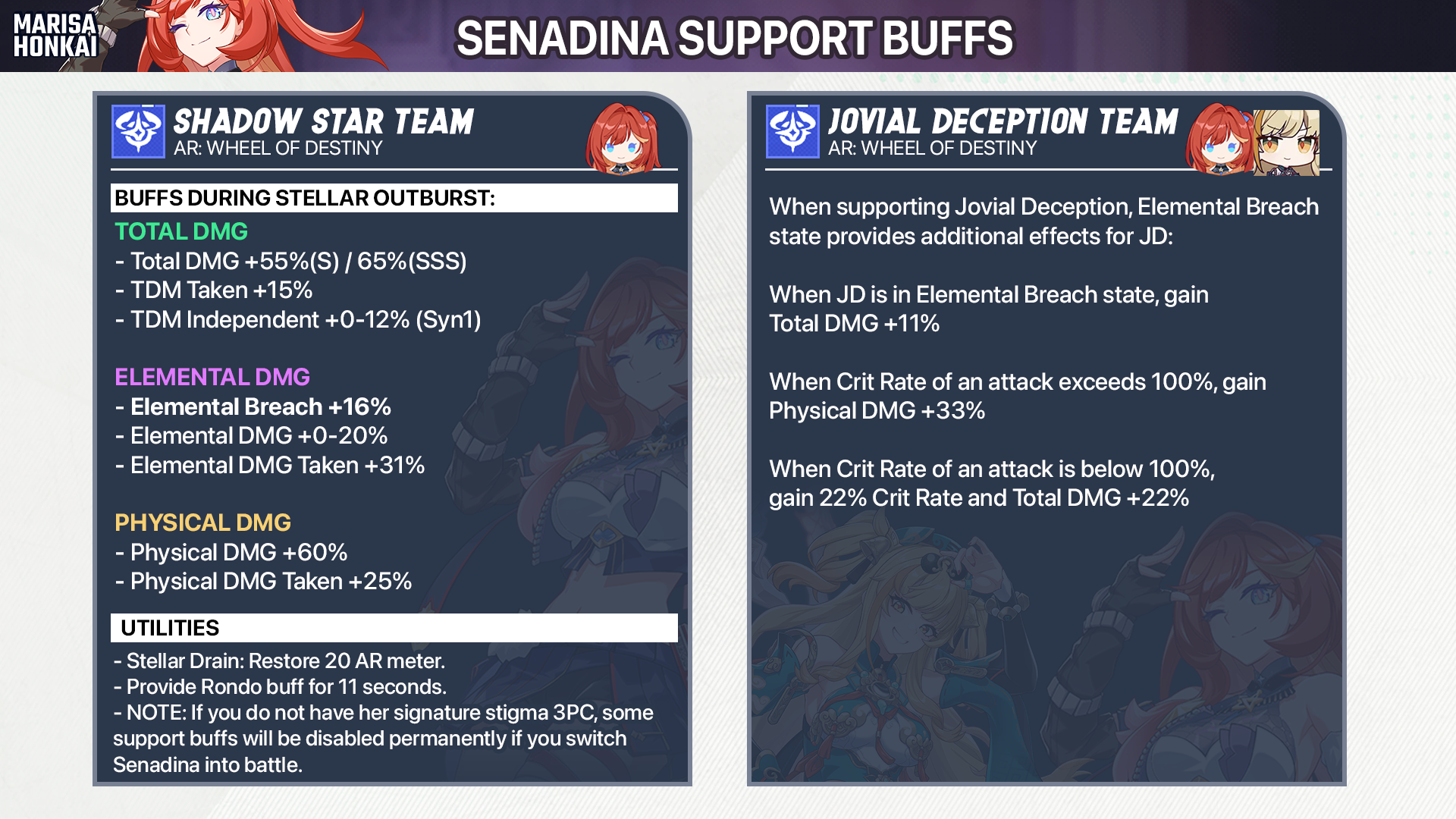 | SS1 | When AR World Star is active: Weapon skill of all valks with Domain Resonance trait gain Total DMG +15% > 20%, and their Elemental Breach +4.5% > 6%. During AR Charging: Enemies take 9% > 12% more Elemental DMG from valkyries with Domain Resonance trait. | DPS World Star Support |