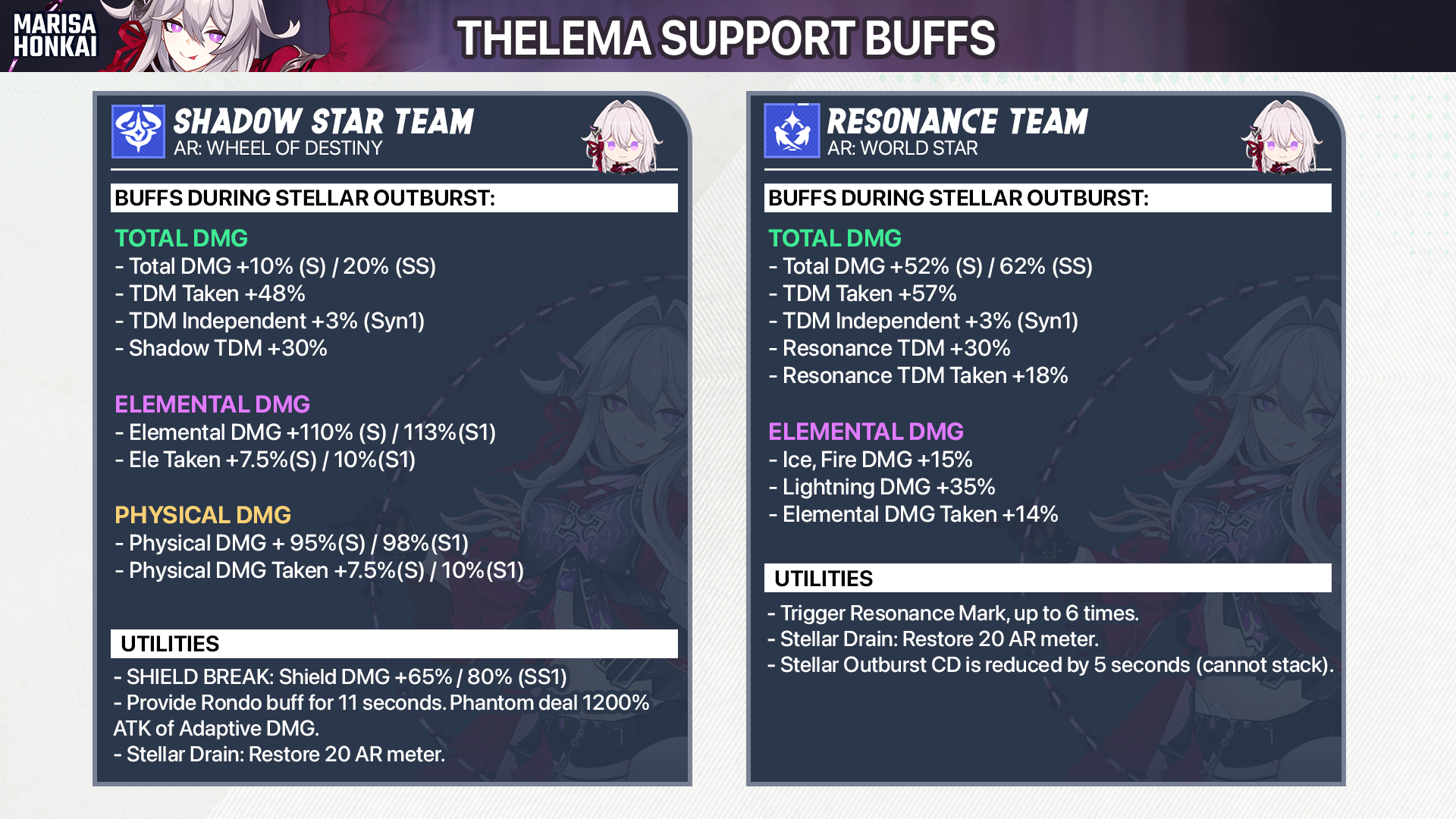 | SS2 | When AR is inactive, Thelema gain Ice DMG and Total DMG +30% > 33% , gain +12% > 16% more against BIO enemies, and enemies take 27% > 30% more Ice DMG from Thelema (independent multiplier). | Part 1 DPS |